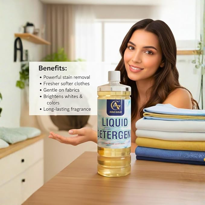 ANVI GOLD Liquid Detergent is a powerful yet gentle formula designed to deliver exceptional cleaning and superior fabric care. It effectively removes dirt and stains while preserving the color and softness of your clothes, leaving them with a delightful, fresh scent. Ideal for all washing machine types and handwashing, providing concentrated cleaning performance in every drop.